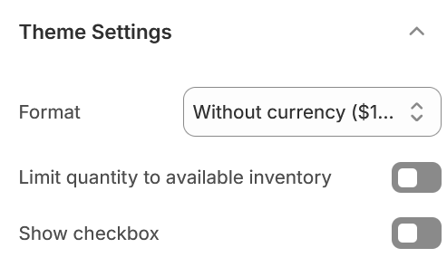 Expand the Theme settings tab to find some adjustments for Currency formatting, quantity limit on inventory, and checkbox for Terms & Agreements.